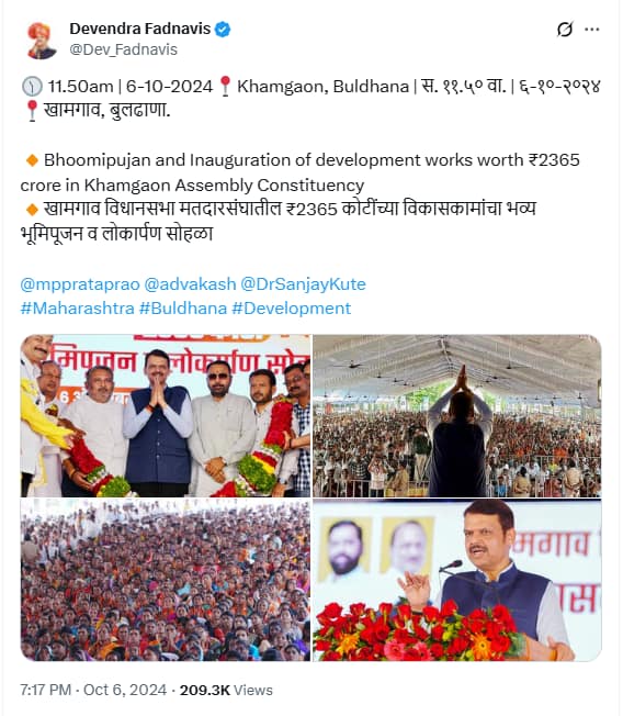 In some parts of Buldhana district, housing development was approved under Pradhan Mantri Awas Yojana Maharashtra, Ramai Gharkul Yojana, Yashwantrao Chavan Free Colony, and Minority Gharkul Scheme. Devendra Fadnavis, when he was the Deputy Chief Minister, instructed the concerned agencies in August 2024 to speed up the work done on Gharkulanchi and provided funds for it. 457 houses had been approved in Chikhali. Fadnavis had also approved the proposal to expand 100 beds in the sub-district hospital in Chikhali and construct an additional building for it. Devendra Fadnavis gave instructions to provide project related certificate under PAP to the owner of the land allotted for Chikhali MIDC, start work on access roads and highway connecting Chikhli, Buldhana and Malkapur and other towns from Palashkhed on Samruddhi Highway, and give the go-ahead to the Khadak Purna project. In October 2024, Deputy Chief Minister Devendra Fadnavis performed bhoomi pujan and inauguration of more than Rs 2,365 crore worth of development works including roads, electricity, water, health, educational infrastructure facilities in Khamgaon.