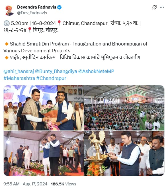 In terms of infrastructure, a large amount of development work was also done in Chimur and Nagbhid taluka of Chandrapur. In August 2024, the then Deputy Chief Minister Devendra Fadnavis laid the foundation stone online for development projects worth Rs 438 crore. This included construction of roads and drains, repair of sub-divisional offices, repair of sub-district hospitals, construction of Talathi offices, construction of government rest houses, construction of auditoriums, as well as funds required for purchase of land from railway. All these works will help in improving the quality of life of the citizens of Chandrapur.