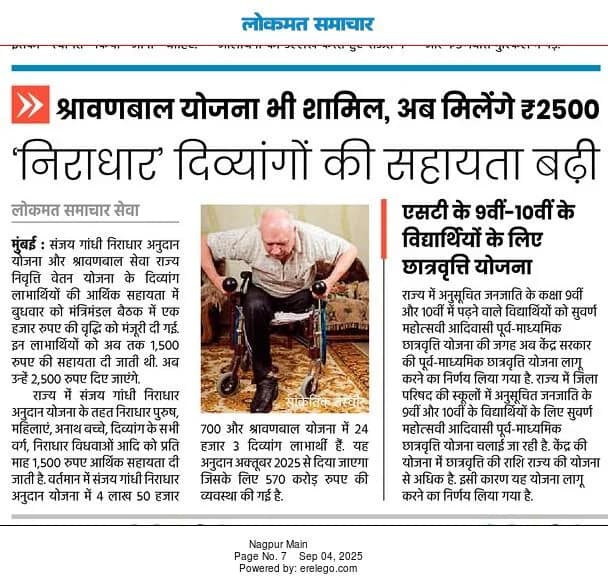 श्रावणबाळ योजनेतील दिव्यांगाना दिलासा! पाच लाख लाभार्थ्यांच्या अर्थसहाय्यात वाढ; दीड हजाराऐवजी मिळणार अडीच हजार रुपये