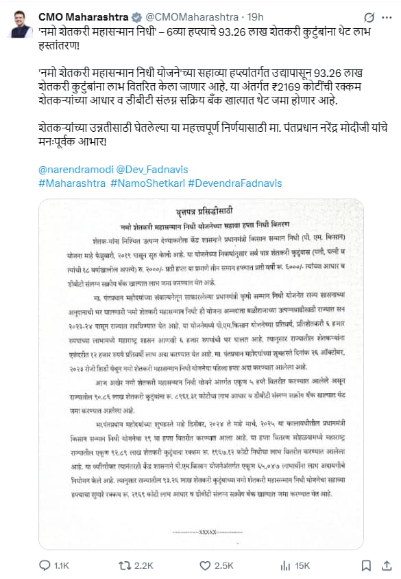 Namo Shetkari Mahasamman Yojana approved – Tweet 12 October 2023